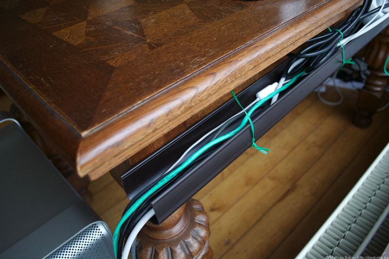 Om de werkplek wat aangenamer te maken, en ook handiger in onderhoud, heb ik achter de tafel een dakgoot bevestigd waardoor alle kabels lopen. Zo is de vloer volledig vrij van kabels. (Want ondertussen is het toch al een flink spaghetti van kabels geworden…)