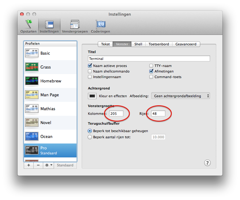 Wanneer je op Mac OS X het Terminal venster maximaliseert zal dit venster niet steeds het hele scherm vullen. Onderaan en rechts van het scherm zal er wat ruimte overblijven. Dit komt omdat het Terminal venster met rijen en kolommen werkt, en dus niet per pixel zal vergroten/verkleinen, maar per rij.