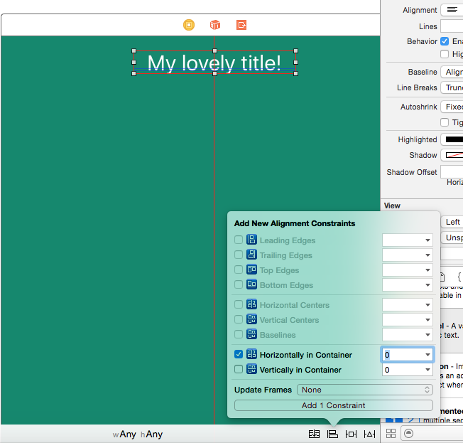 Now we want to center the label on all screen sizes. Therefor you can add ‘responsive’ constraints to your storyboard elements. At the right bottom corner of the storyboard panel, there are 4 buttons. Click on the second button to add aligning constraints: select the horizontal constraint and click on “Add 1 constraint”.
