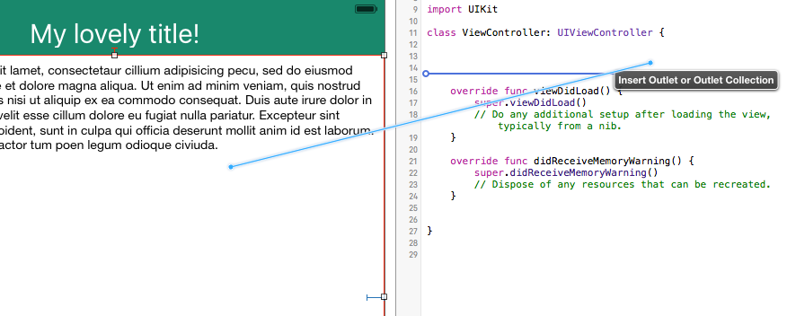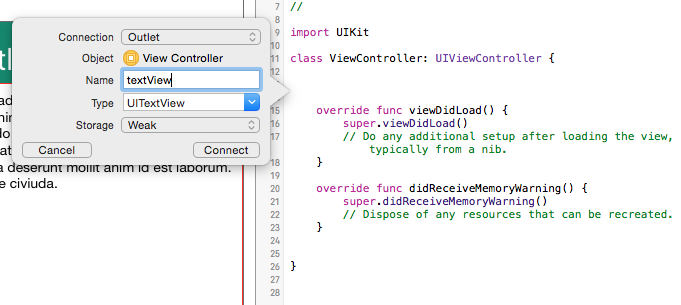 If we want to actually do something with the TextView, we need to create a referencing outlet for it in the ViewController.swift file. In the right top navigation click on the editor icon (the two overlapping rings). This will open a second, split view with the code of the ViewController. Now press the ctrl key and drag the TextView into the code at the right side and give the outlet a name.